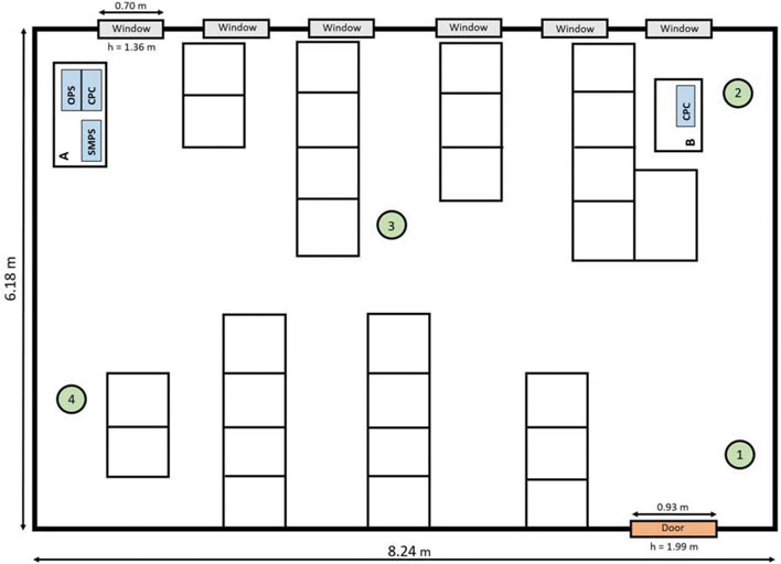 図 1:空気清浄機(#1 から 4)および A と B の 2 箇所に配置された測定機器の位置を示す教室の略図。