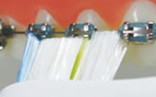 プラケットの歯に近い部分は汚れが溜まりやすいところです。ブラシを歯と並行にすることで確実に取り除く事ができます。
